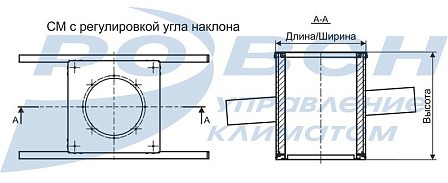 Компоновки 01, 02, 03, 04 предназначены для установки крышного вентилятора на кровле без уклона, компоновки 11, 12, 13, 14 - для установки на кровле с уклоном. Угол наклона опоры стакана монтажного регулируется в пределах от 4 град до 24 град.